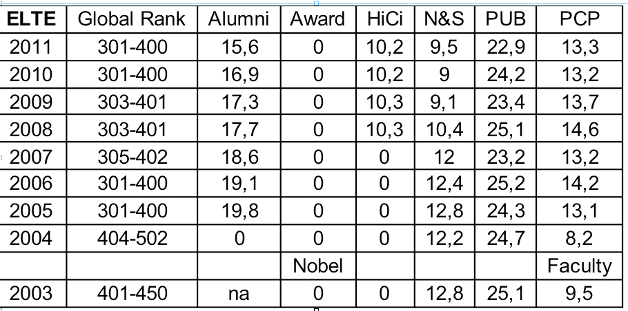 Kevés alkalmatlanabb mérce létezik az egyetemi teljesítmény értékelésére, mint a globális felsőoktatási rangsorok köre. (Erről részletesen az ELTE Pszichológiai Intézete Társadalmi Kommunikáció Kutatócsoportja közreműködésével rövidesen induló rangsor.hu oldalunkon jelennek meg részletes elemzések, addig is általános felvetések olvashatók itt és itt.) De ha már akkora a sajtó- és politikusi érdeklődés eziránt, amekkora, egy kis áttekintés nem árthat: