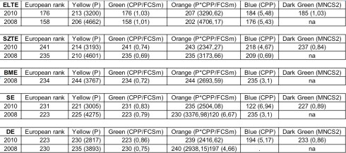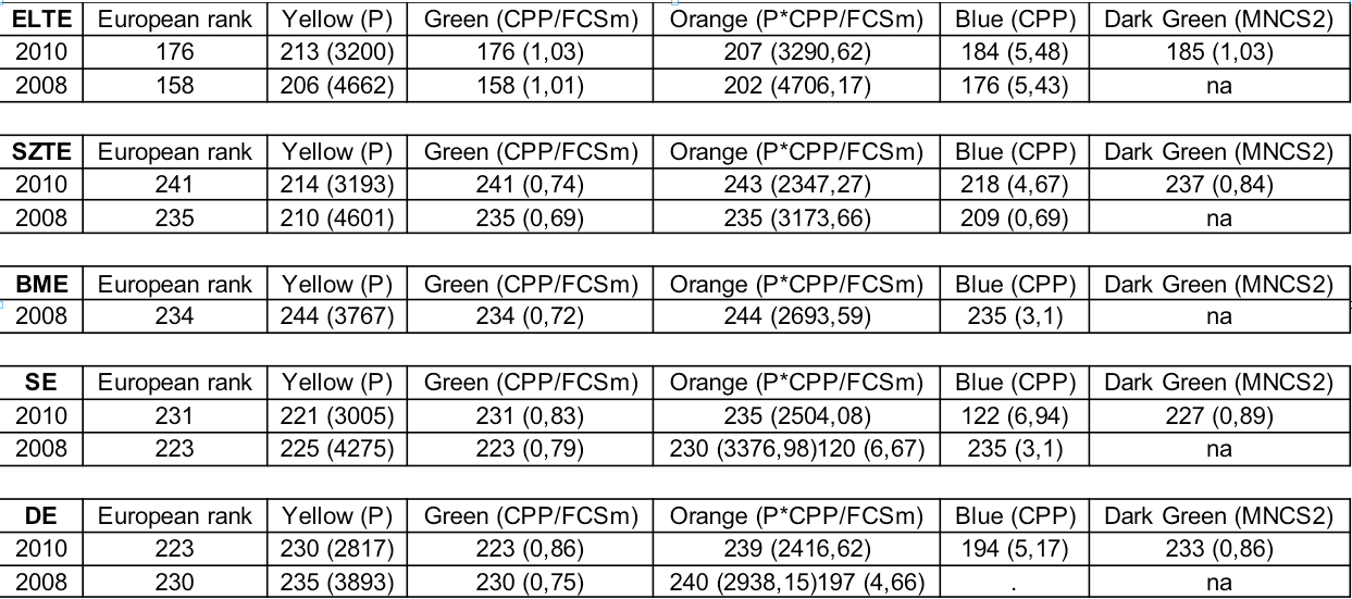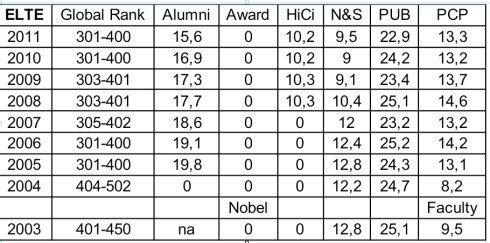 Látható, hogy az ELTE és a SZTE esetében vagy csak a volt, vagy csak a jelenlegi alkalmazottak között találhatunk Nobel- vagy Field díjas kutatót, a másik érték ennek megfelelően 0. Az intézményi méreteket figyelembe vevő PCP indikátor pedig csak 10%-os súllyal szerepel az összesítésben, így valójában kevéssé alkalmas arra, hogy az egyetemek nagysága közötti különbségeket kiegyenlítse.