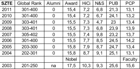 Az ARWU 500-as rangsorában az Eötvös Loránd Tudományegyetem és a Szegedi Tudományegyetem szerepel Magyarországról. (A BME 2004-ben került be az 500-as listára, azonban esetében a műszaki területek publikációs sajátosságai miatt eleve korlátozott a jó szereplés lehetősége.) Az itt alkalmazott indikátorok jellege egyértelműen kedvez a nagy múlttal rendelkező kutatóegyetemeknek, hiszen az indikátorok között fontos szerepet kapnak az intézmény kutatói által elnyert díjak. Itt akár egy Nobel-díjas kutató is sokat változtathat az intézmény pozícióján.