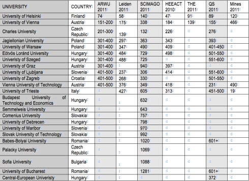 A globális összevetések persze félrevezetőek, hiszen a magyar egyetemeket nyilván ésszerűtlen a vezető amerikai vagy angol intézményekhez mérni. Inkább azokkal érdemes összehasonlítani magunkat, amelyek nemzetközi felsőoktatási-tudományos piacon társadalmi-történeti beágyazódásuk illetve regionális elhelyezkedésük miatt érdemben versenytársaink.