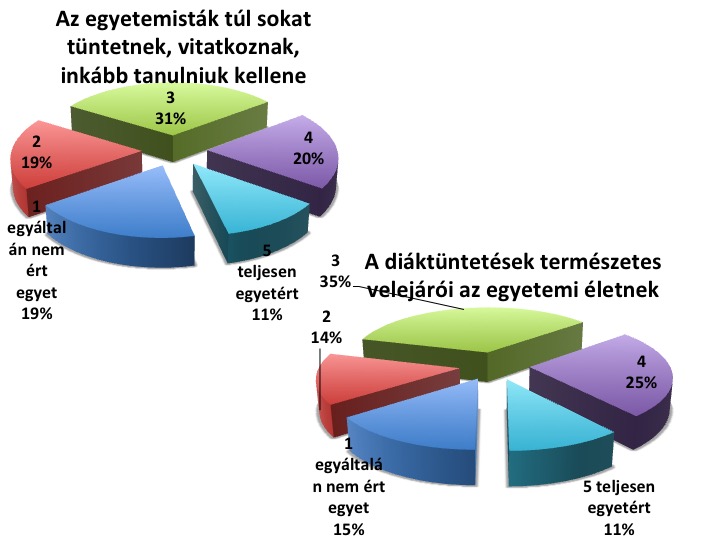 Látszik tehát, hogy a közvélemény teljesen polarizált az ügyben. Nyilván benne vannak ebben a politikai elköteleződések és a különféle irányú média-manipulációk is, de a végeredmény ezek beszámításával is világos üzenet: a hallgatók nem számíthatnak magától értetődő támogatottságra, azért világos és kellően hiteles fellépéssel kell megkűzdeniük. (Vagy, immár aggodalmas korba lépve: óvakodniuk kell attól, hogy rosszul mérjék fel a valós társadalmi hatásukat…)
