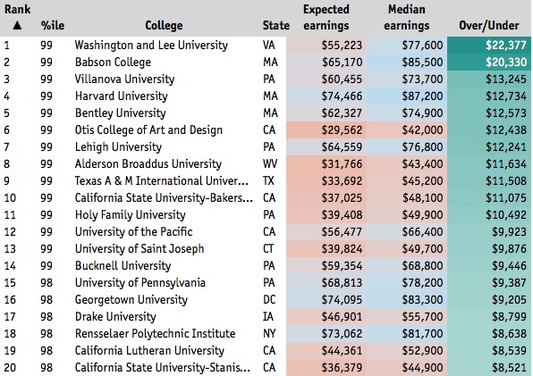 A The Economist ráunt a U.S. News rankingjének sokat bírált módszertani problémáira és egy olyan rangsort jelentetett meg, amely az amerikai egyetemeket abból a szempontból rendezi sorba, hogy a diplomájukkal milyen (kereset-)többlethez juthatnak a diplomások. Az Obama-adminsiztráció által szorgalmazott, nemrég megjelent adatbázis felhasználásával vetik össze az adott évfolyam fiataljainak átlegkeresetét a diplomások bérével. A ranking meglepetése, hogy a megszokott csúcspozíciós elit-egyetemek helyett a nagyvilágban kevésbé ismert intézmények mutatják a legjobb eredményeket – egyedül a Harvard jelenik meg a megszokott éllovasok közül az itteni első húszban.